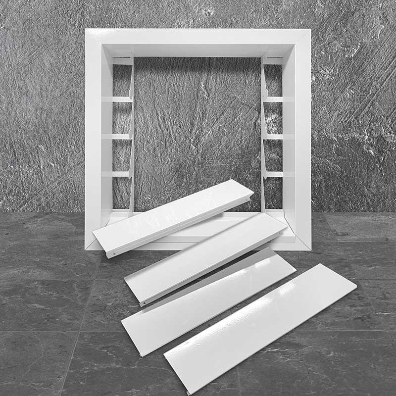ВРЖС представляет собой конструкцию из рамки и индивидуально установленных ламмелей, которые возможно снять/установить независимо от других ламмелей, что является бесспорным преимуществом если необходимо производить ревизию вентиляционного проёма.
