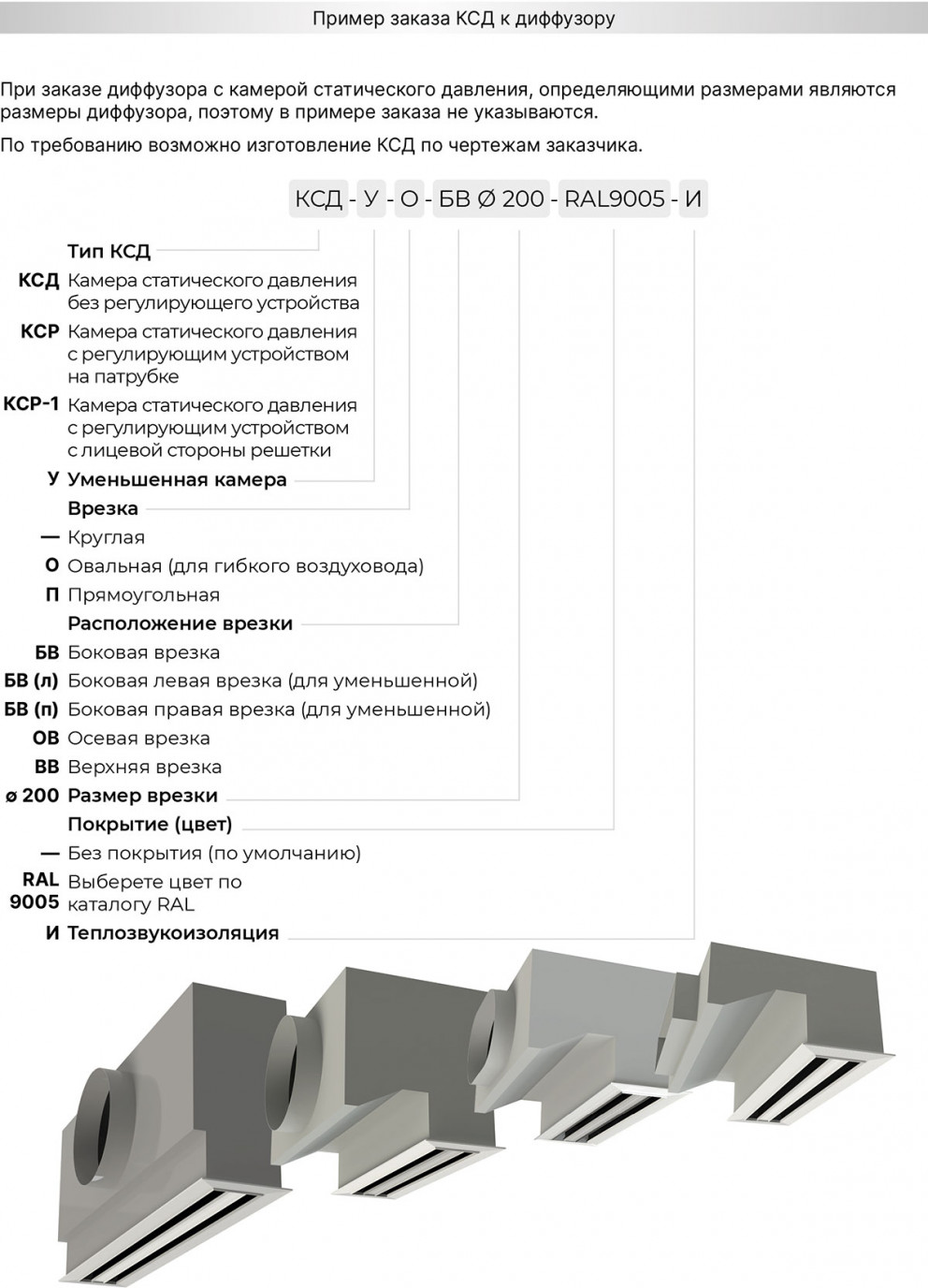 Для подключения диффузора к системе воздуховодов используется камера статического давления - КСД или КСР.