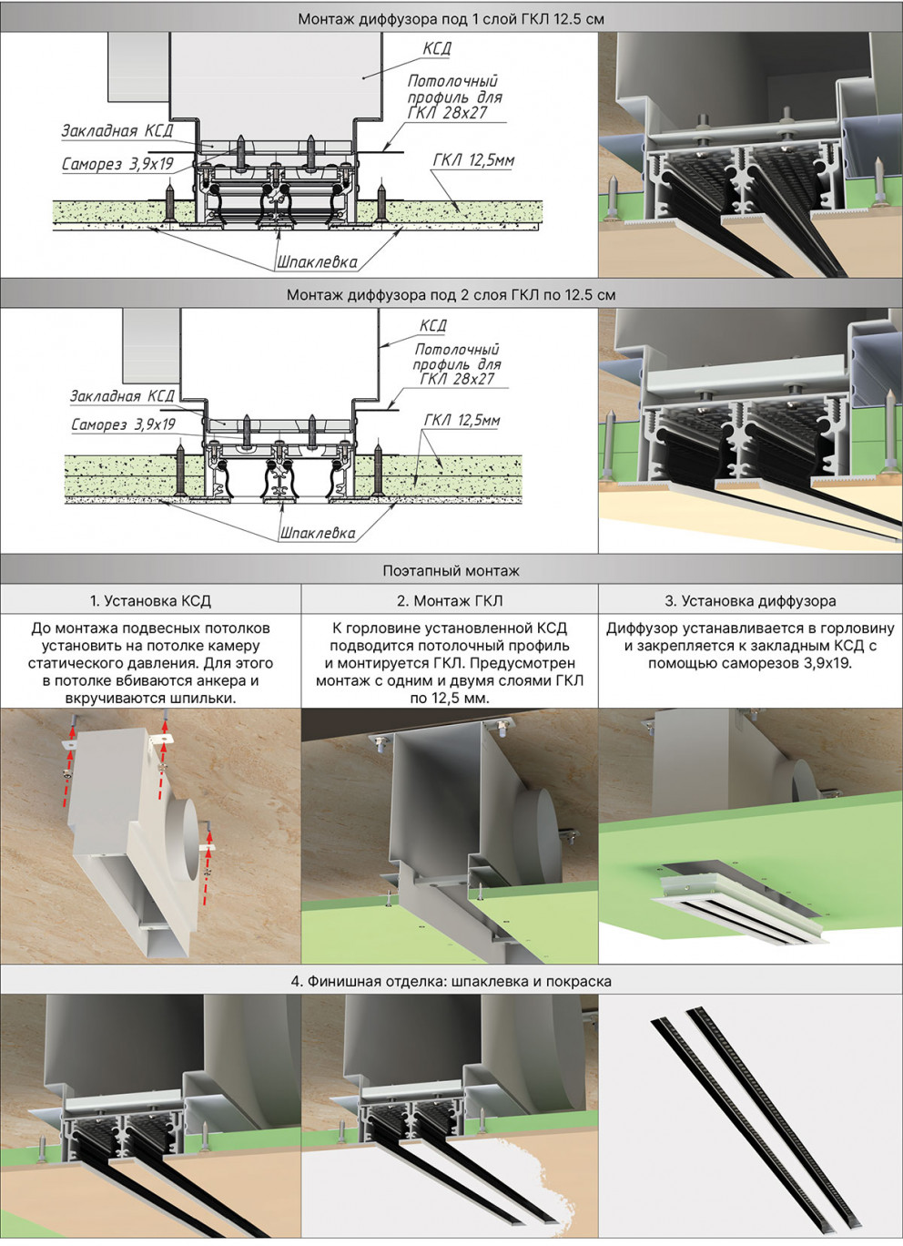 Для подключения к системе вентиляции и кондиционирования используется камера статического давления (адаптер) - КСД или КСР.