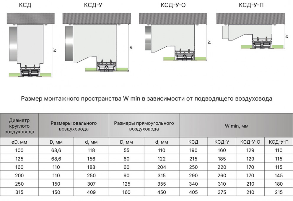 Размер монтажного пространства (W) напрямую зависит от размера подключаемого воздуховода - чем меньше воздуховод, тем меньше адаптер для диффузора. В каталоге приведены рекомендуемые размеры воздуховода, но по запросу заказчика возможно изготовить адаптер с любой врезкой.
