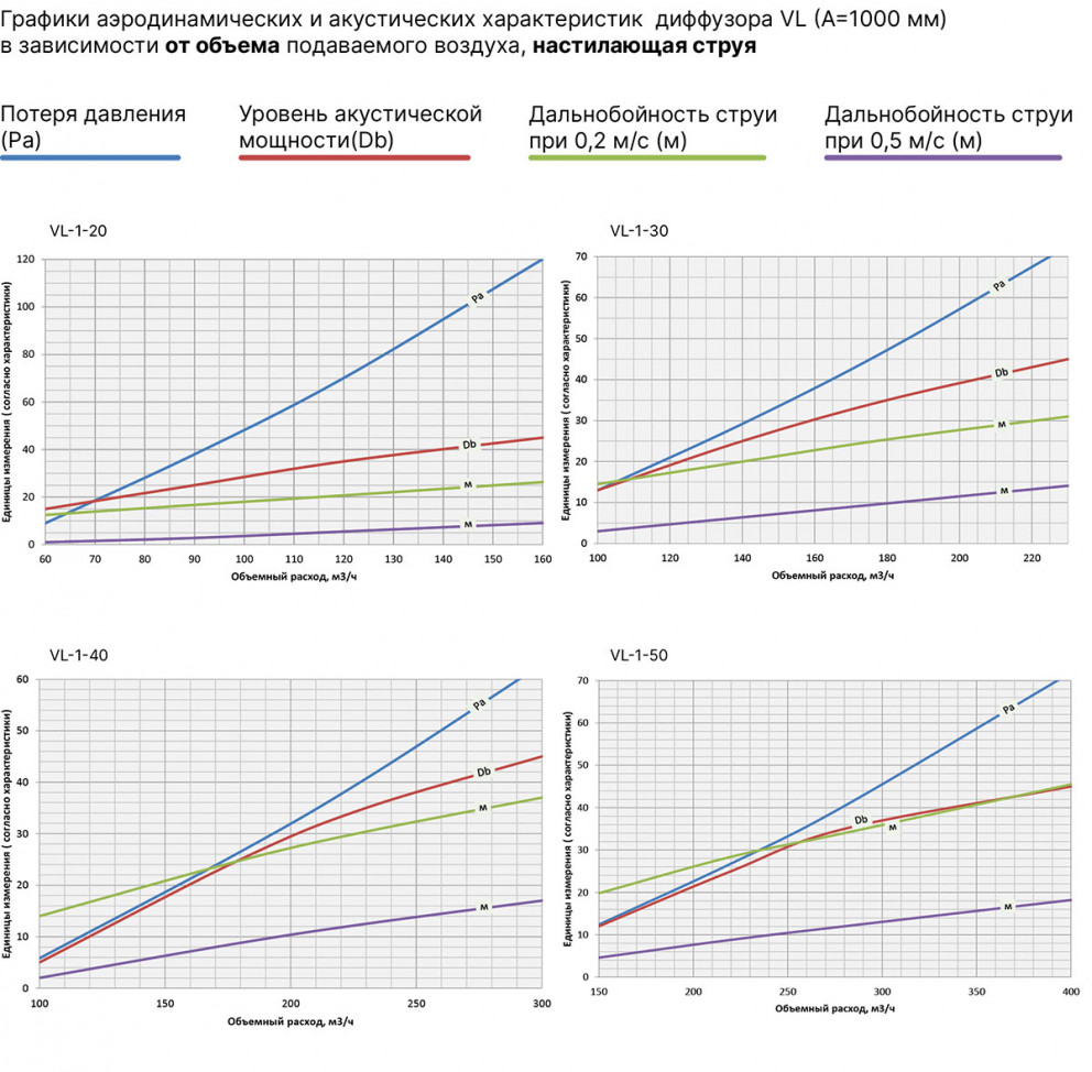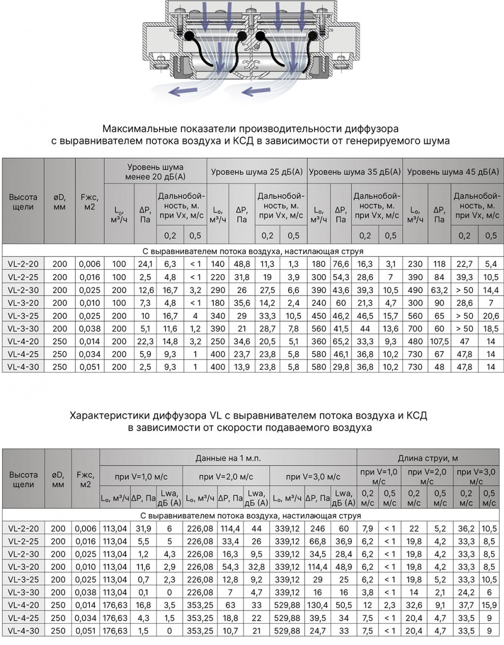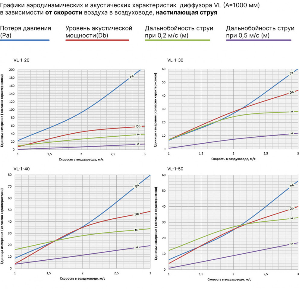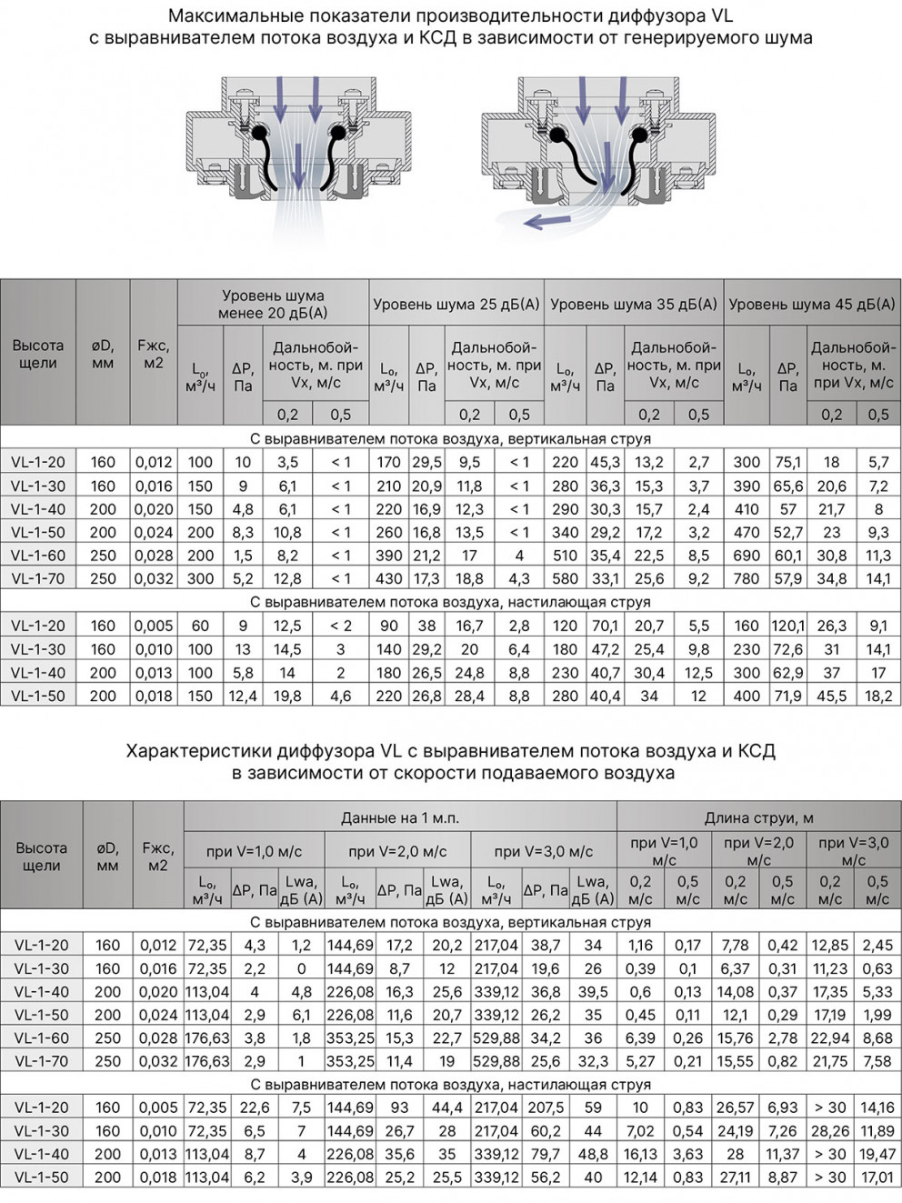 Таблицы быстрого подбора диффузора VL (1 щель, А=1000 мм)