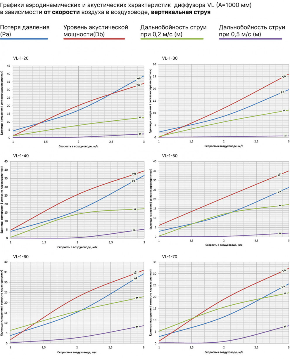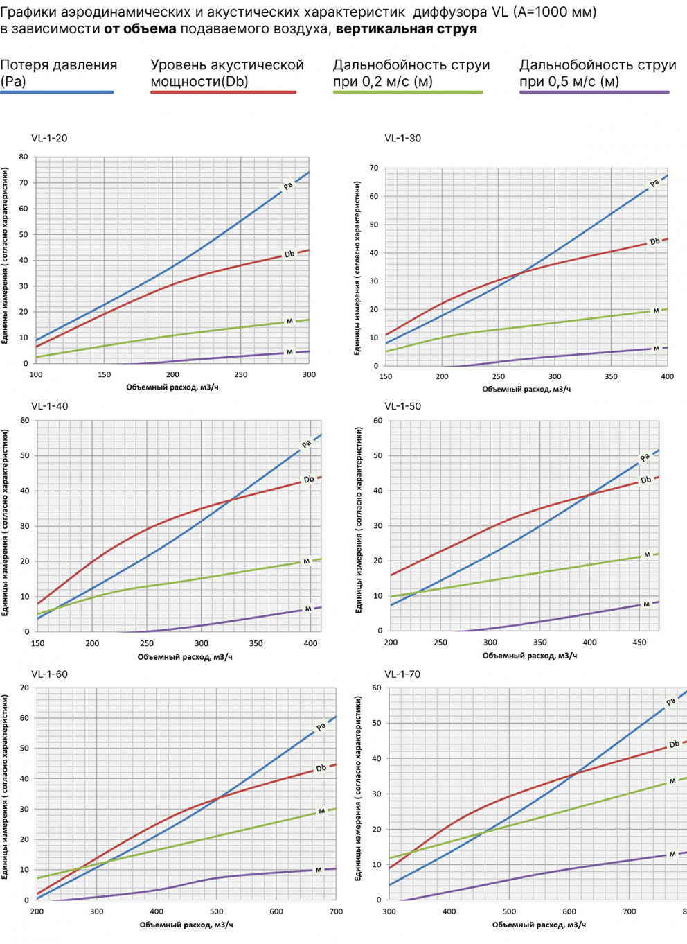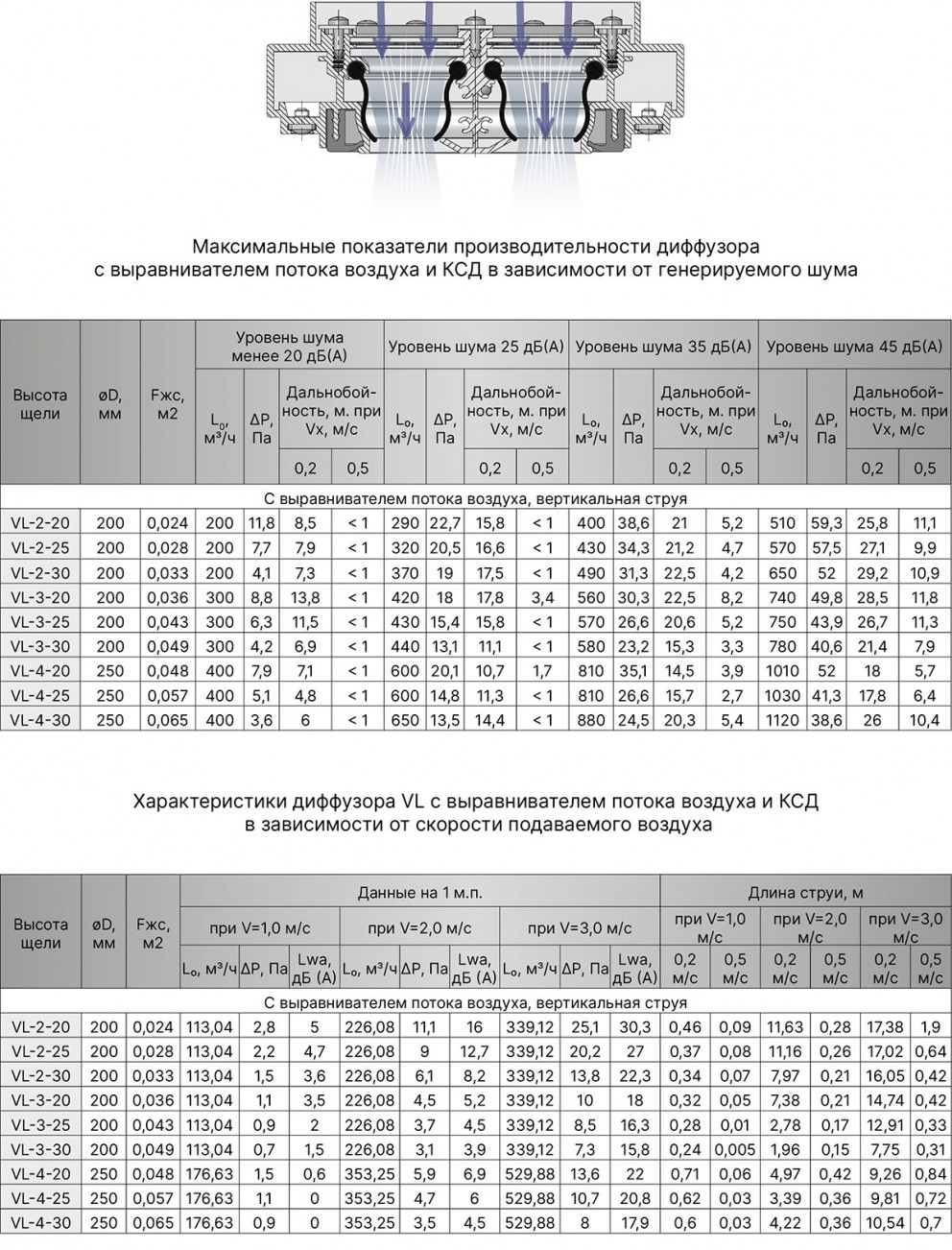 Таблицы быстрого подбора диффузора VL (1 щель, А=1000 мм)