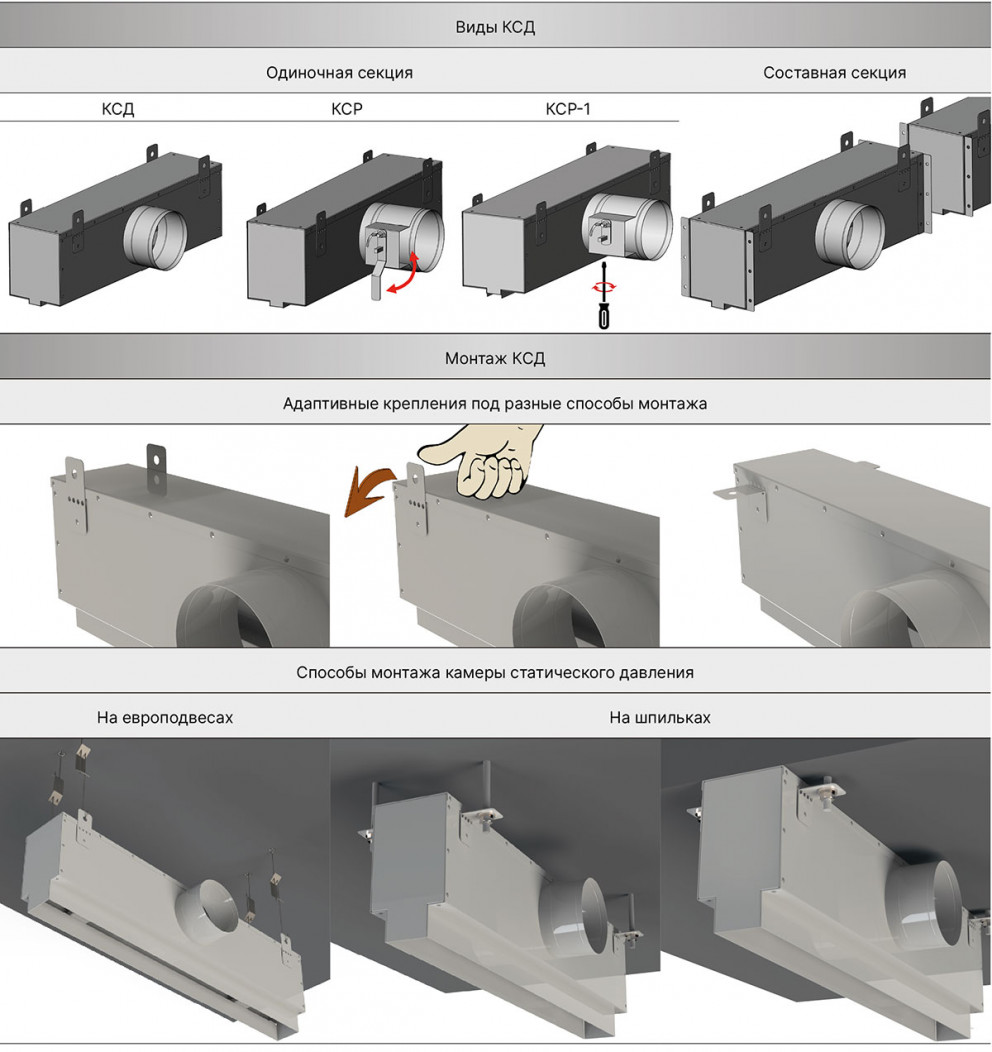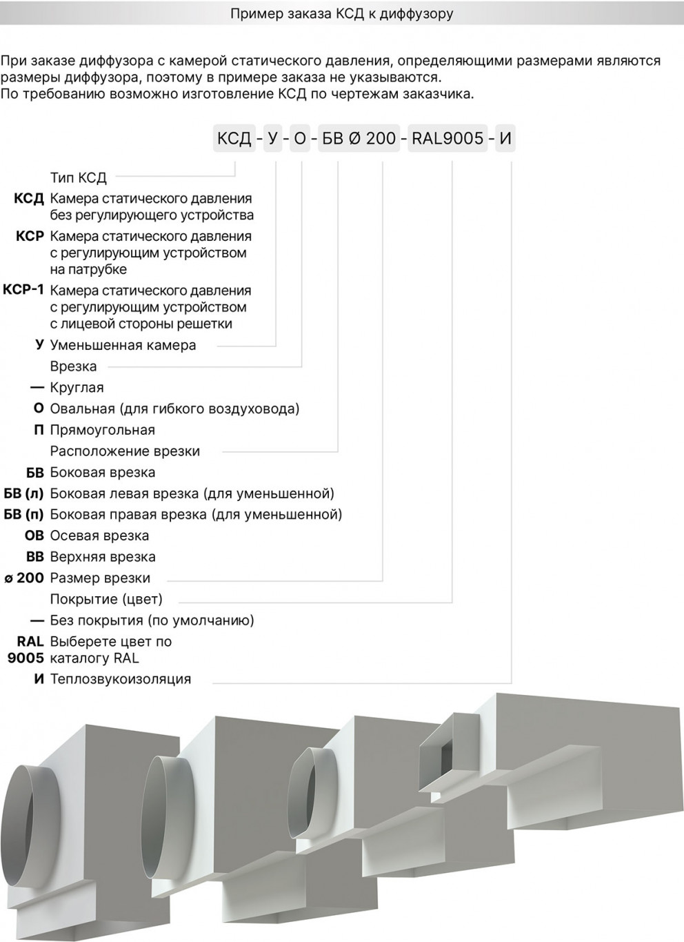 Для подключения к системе вентиляции и кондиционирования используется камера статического давления (адаптер) - КСД или КСР.