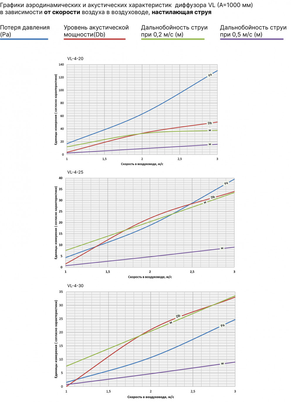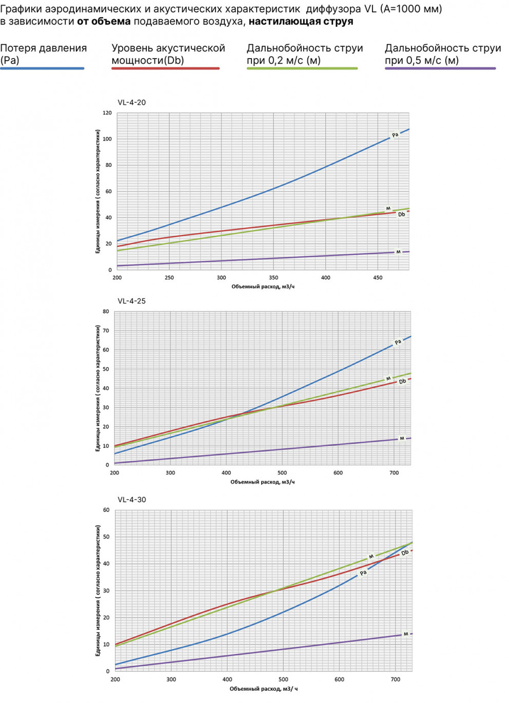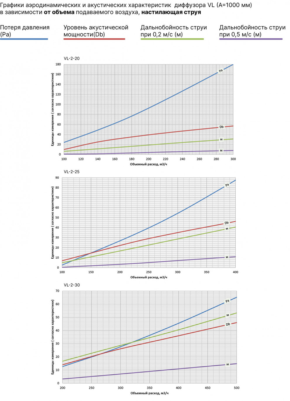 Таблицы быстрого подбора диффузора VL (2, 3, 4 щели, А=1000 мм), вертикальная струя