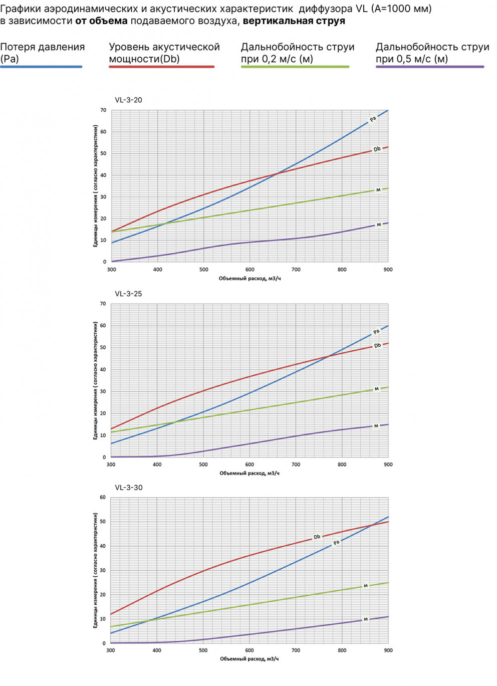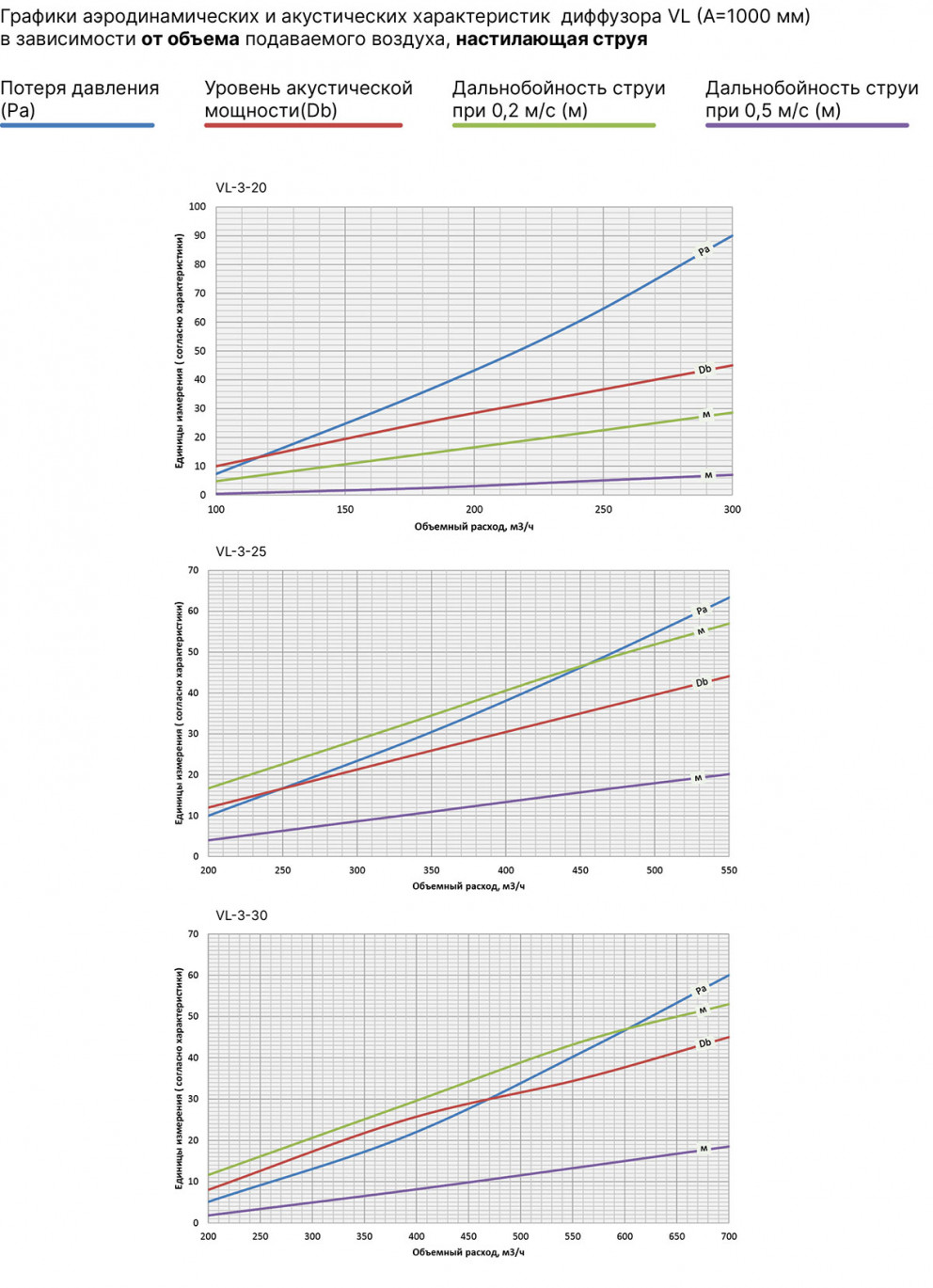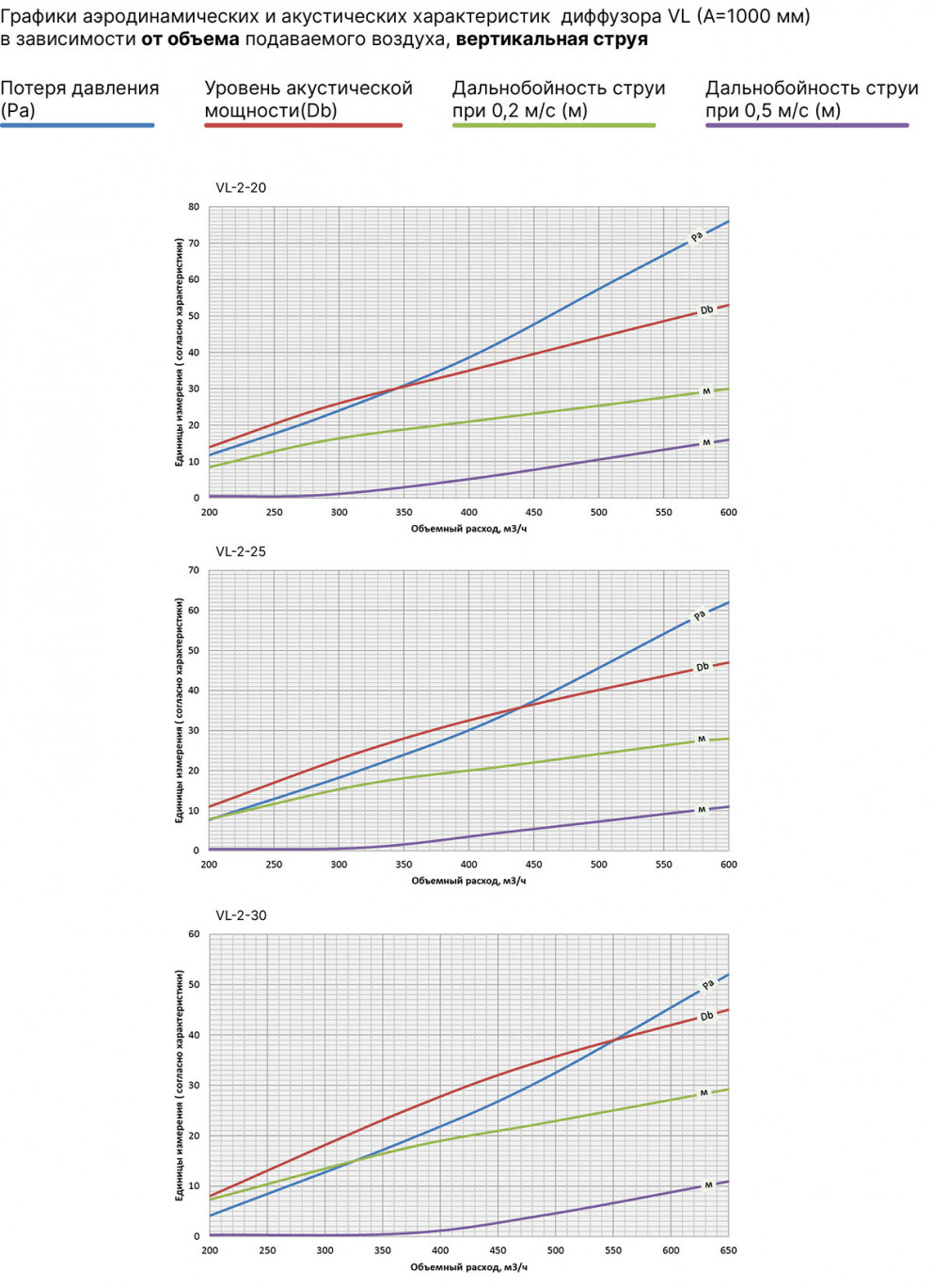 Таблицы быстрого подбора диффузора VL (2, 3, 4 щели, А=1000 мм), вертикальная струя