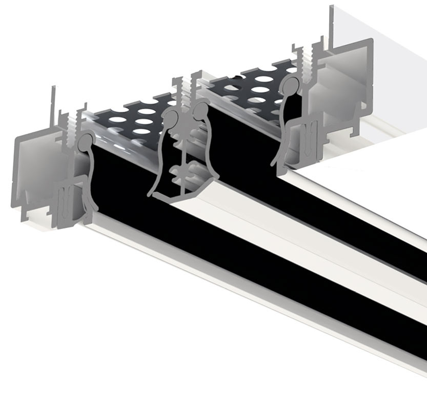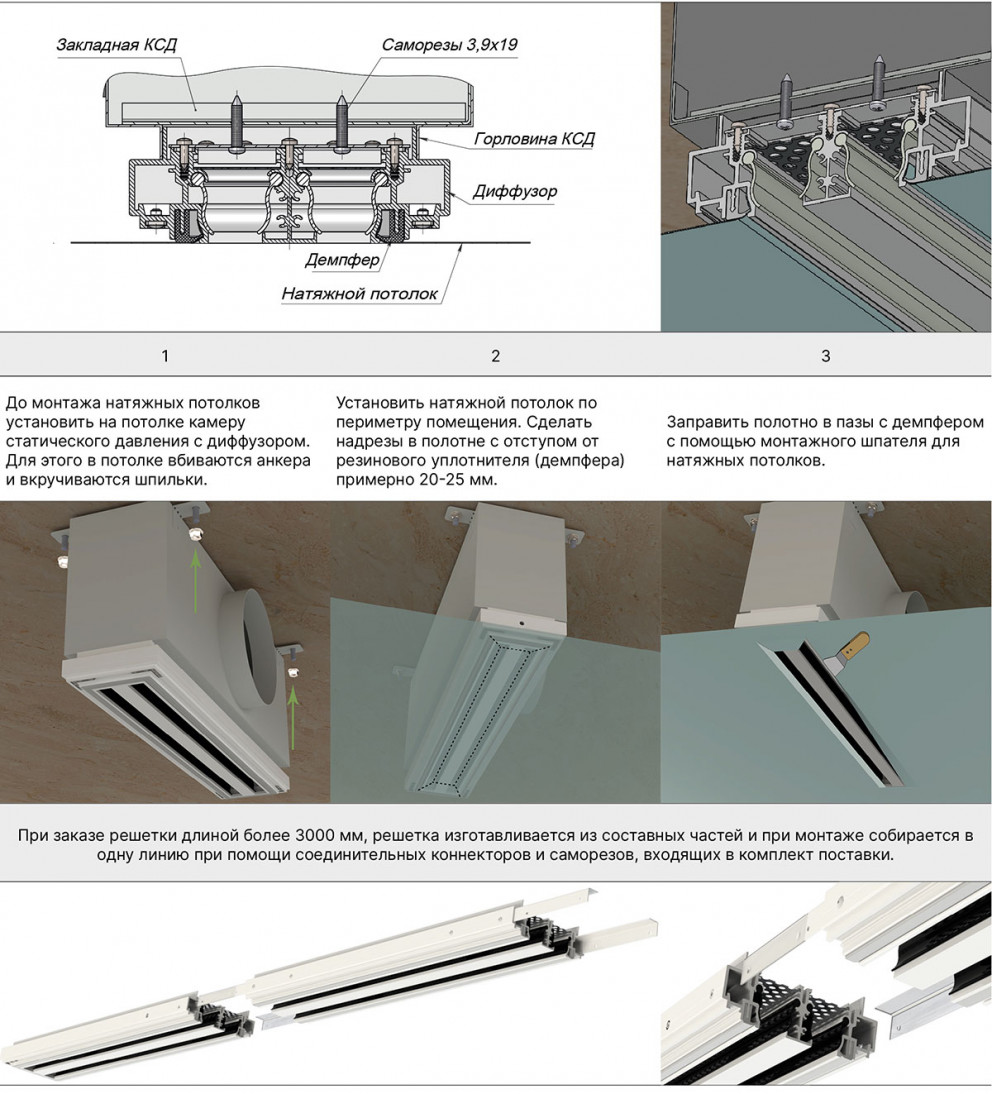 Конструкция профиля решетки предусматривает специальный паз с резиновым уплотнителем (демпфером) для установки натяжного полотна. Специально разработанная форма демпфера обеспечивает надежную фиксацию любого полотна (ПВХ, ткань) за счет прижимного «язычка», который жестко фиксирует полотно к профилю рамы диффузора. После монтажа решетки, видимой частью в помещении остаются только щели.