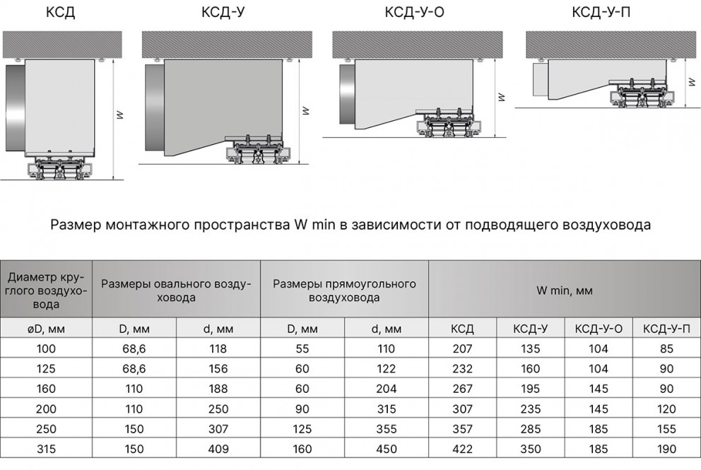 Размер монтажного пространства (W) напрямую зависит от размера подключаемого воздуховода - чем меньше воздуховод, тем меньше адаптер для диффузора. В каталоге приведены рекомендуемые размеры воздуховода, но по запросу заказчика возможно изготовить адаптер с любой врезкой.