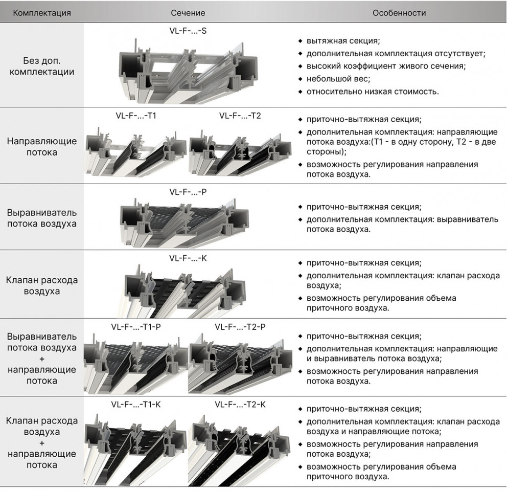 Варианты центральных ламелей щелевых диффузоров VL-F