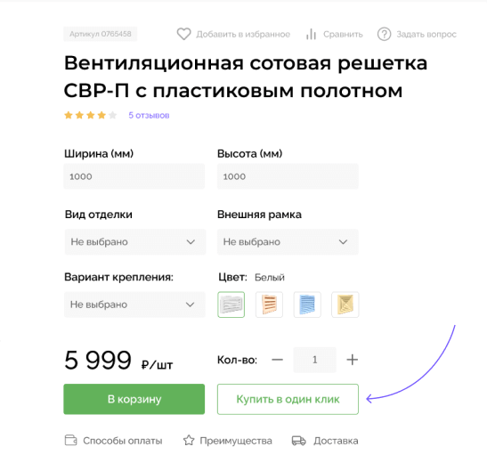 Функция «Купить в 1 клик» доступна только для товаров имеющихся в наличии. Позволяет покупателю проходить всю процедуру оформления заказа с помощью оператора.